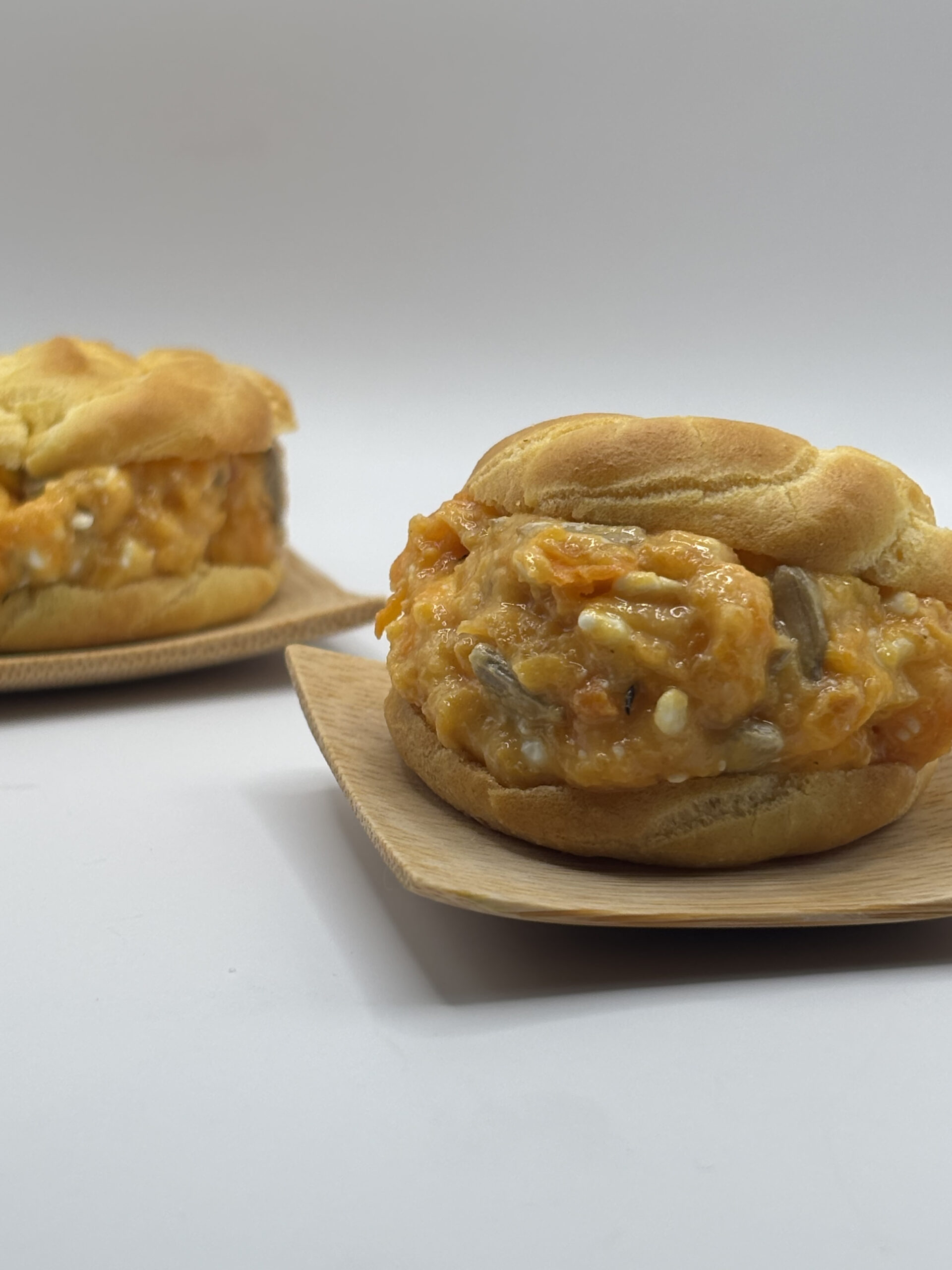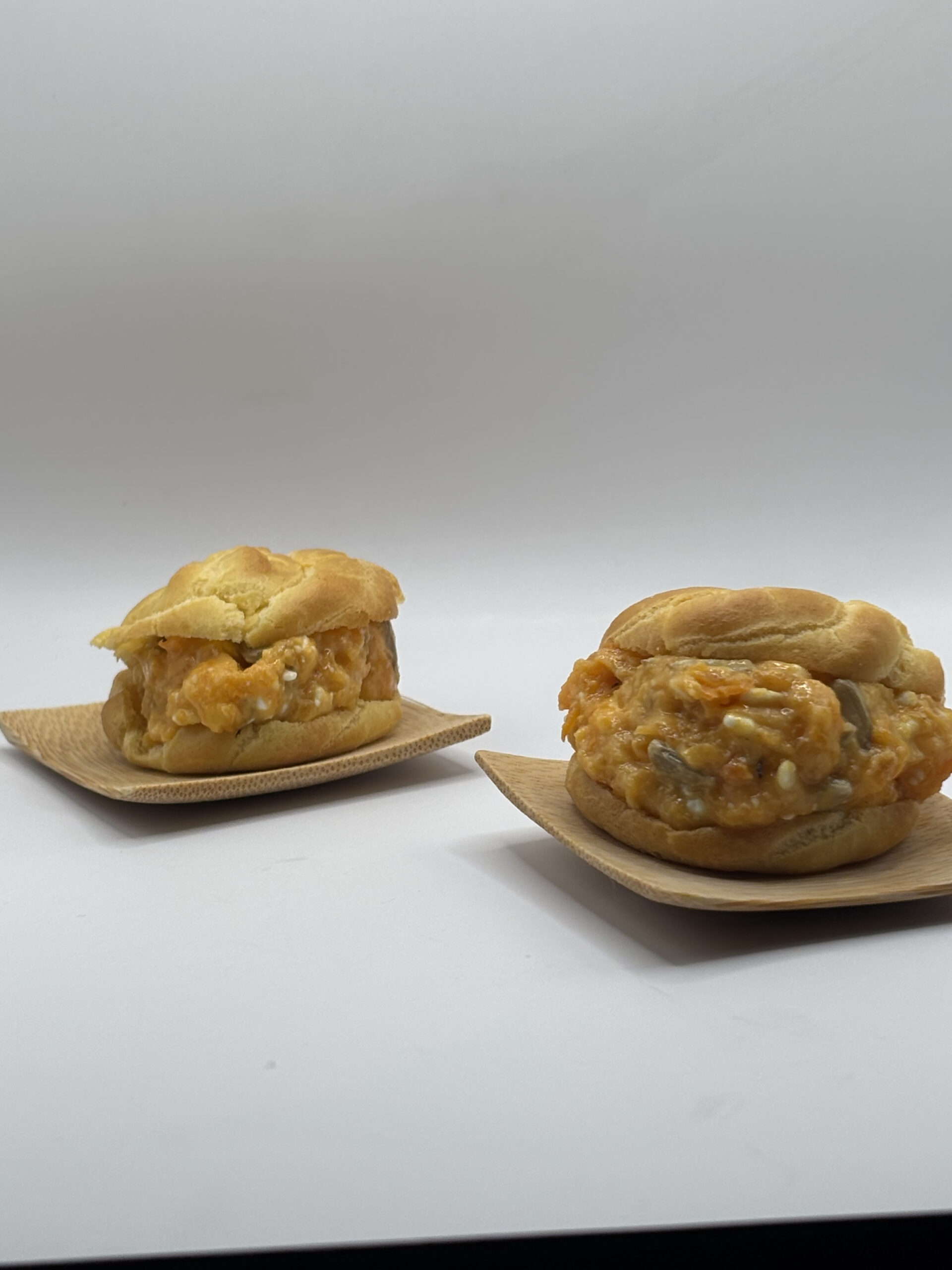 Profiteroles de calabaza asada con queso feta y pipas